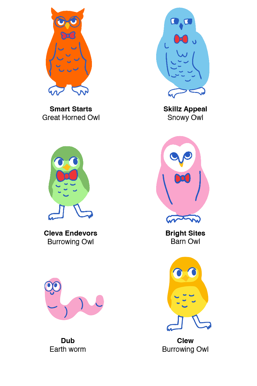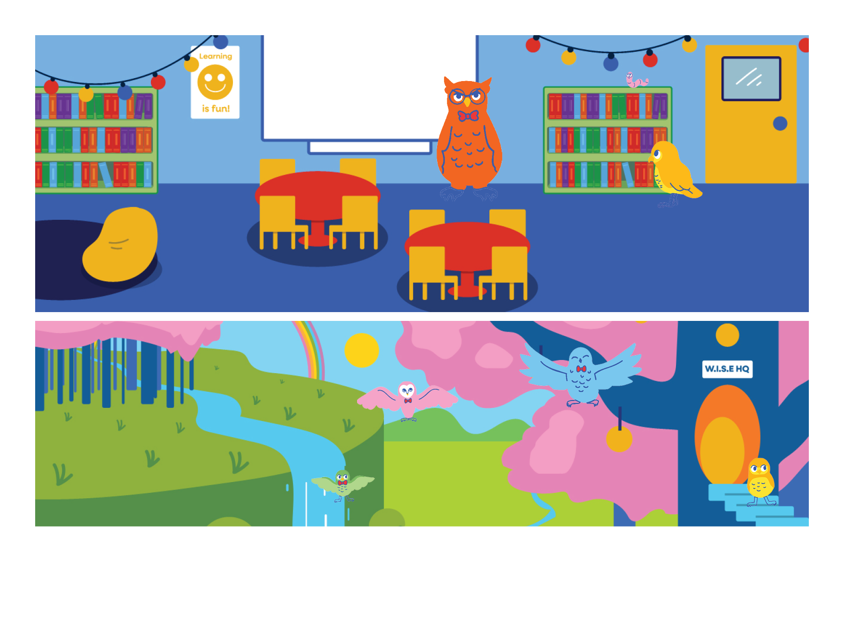 Imagiread is a reading program designed for children. These bubbly owls and backgrounds were designed as an additional extension of an existing character sheet for this client. The system includes backgrounds and multiple character positions.